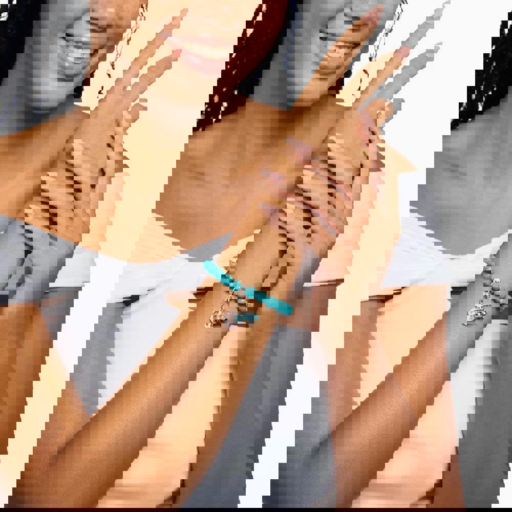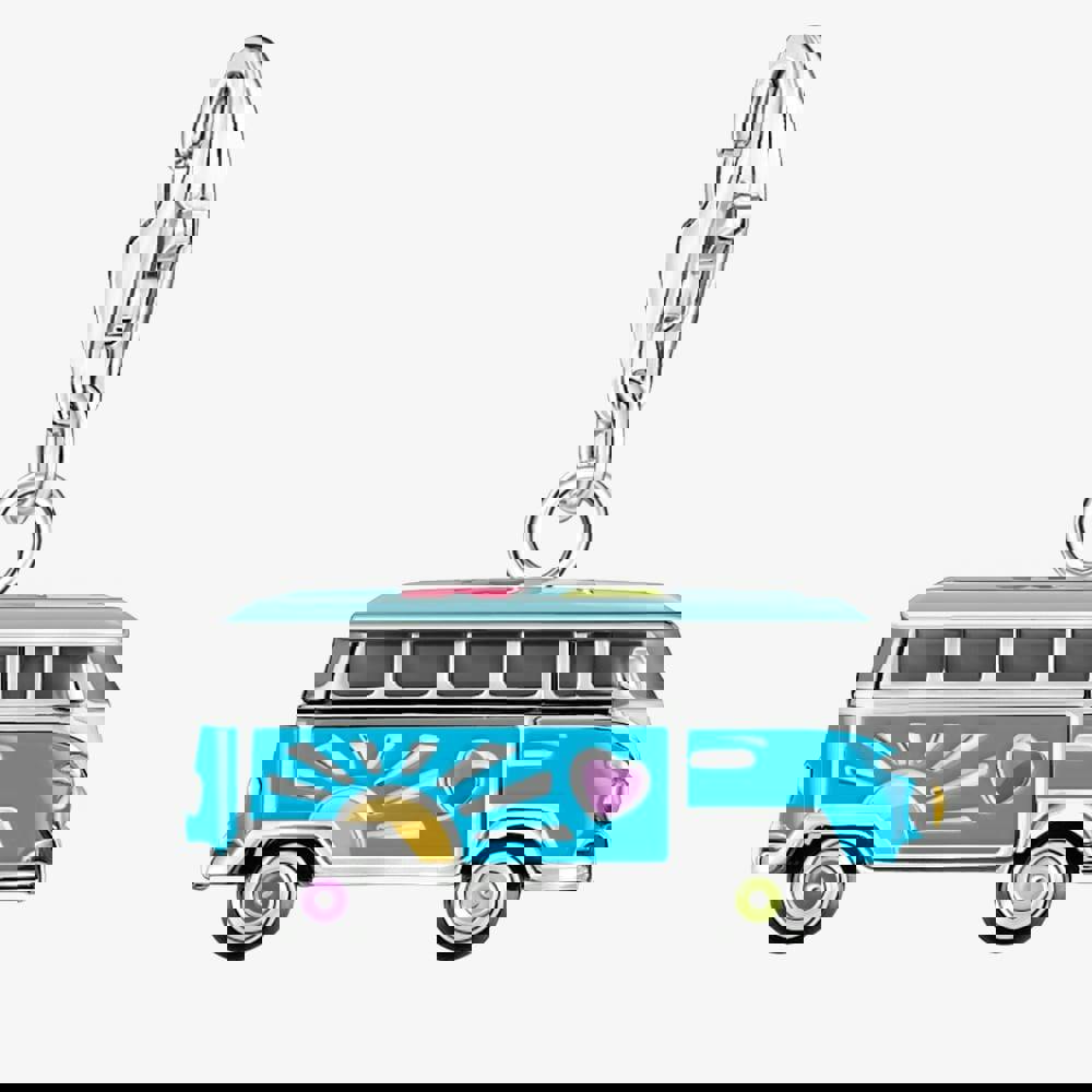 This charming piece is designed in the shape of a classic VW bus, a symbol of adventure and freedom. The detailed enamel work in vibrant blue, along with multicoloured stone accents, brings a playful and nostalgic touch to the design. Perfect for travel lovers, this charm adds personality to any bracelet or necklace.