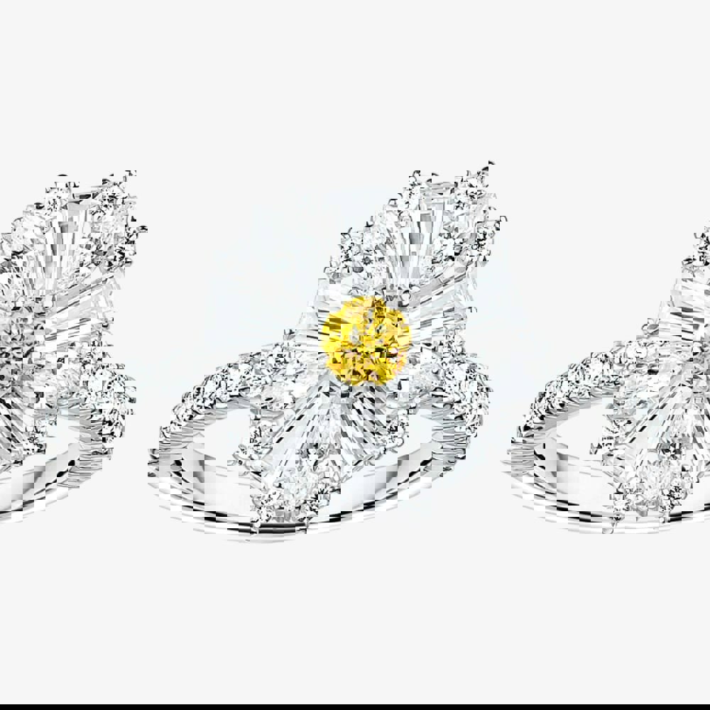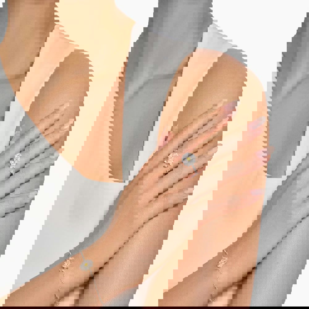 This elegant ring beautifully blends delicate floral design with sparkling brilliance. It features a captivating shoulder set design, highlighting a charming daisy flower adorned with shimmering cubic zirconia stones. Its delicate daisy design, combined with the sparkling cubic zirconia stones and unique shoulder set design, makes it a truly eye-catching accessory. An ideal addition to any jewellery collection