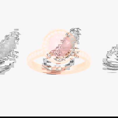 THOMAS SABO introduces this radiant 18 carat rose gold plated sterling silver ring featuring a rose pink quartz centrepiece surrounded by a halo of clear Cubic Zirconia. Complete your look and stand out among the crowd with this sparkling piece.