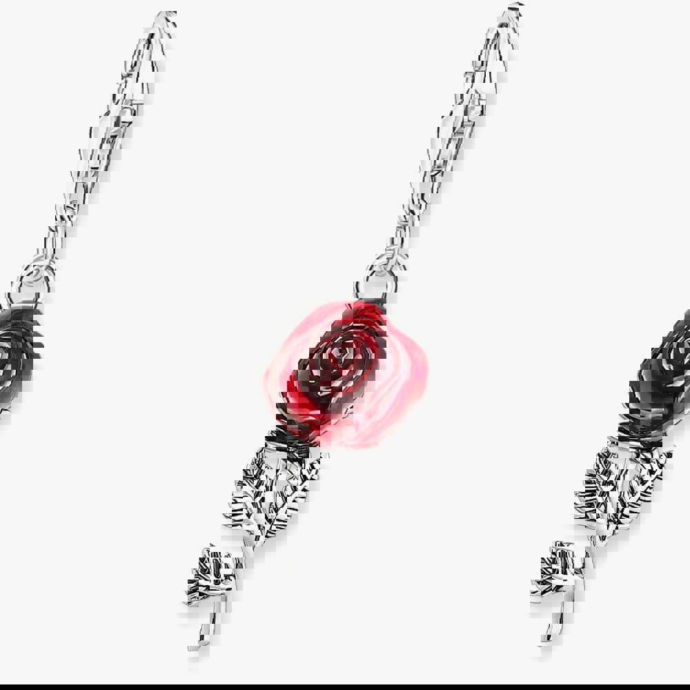 This charm crafted from recycled, slightly blackened silver takes the form of a three-dimensional stem rose. The blossoming petals are delicately hand-painted with red cold enamel, while the leaves showcase finely engraved lines, adding intricate details to the design.