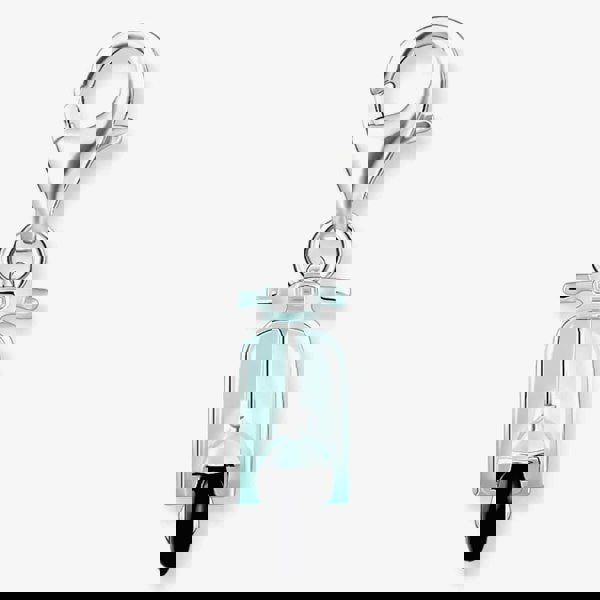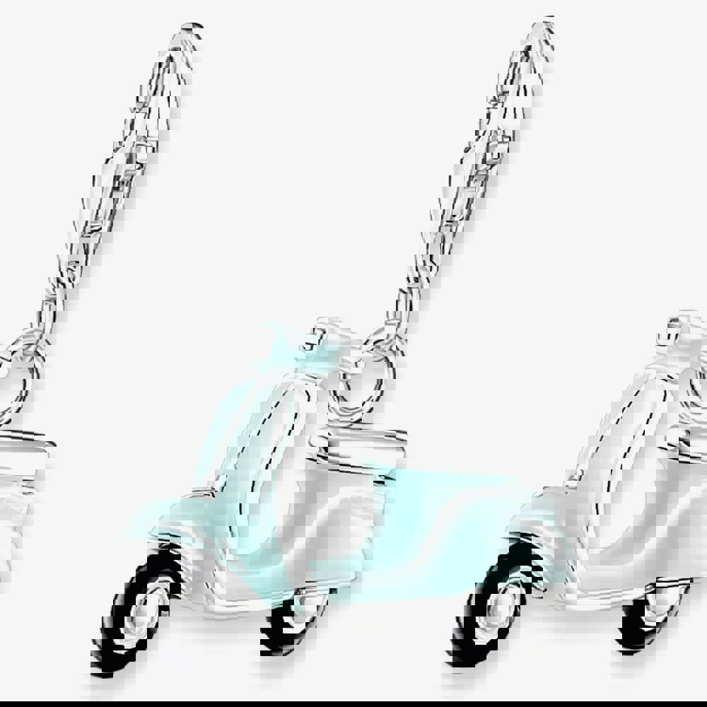 An eye-catching charm club charm which is created in sterling silver & features a motor scooter design set with turquoise & black enamel & sparkling cubic zirconia stones. This charm is completed with a lobster clasp fastening so can be attached to Charm Club bracelets or necklaces to suit your style.