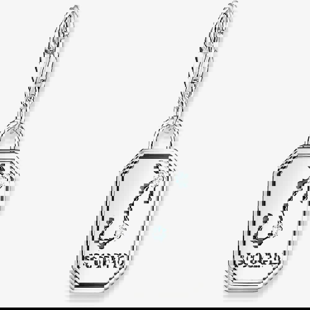 This octagonal-shaped charm is crafted from recycled silver with a slightly blackened finish, this exquisite charm features the iconic Scorpio zodiac sign adorned with small, sparkling white zirconia stones. Perfect for adding a touch of celestial elegance to your charm bracelet or necklace.