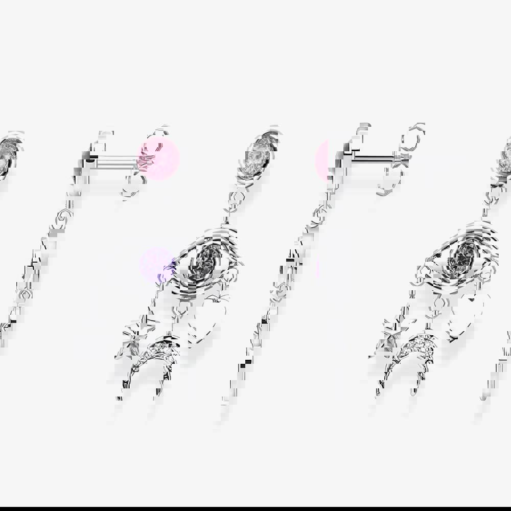 These 925 Sterling silver earrings, slightly blackened, feature a captivating 3D eye with a violet zirconia stone, symbolizing good luck. Below the eye, there's an artfully designed composition with a faceted star, a half-moon adorned with white zirconia stones, and a heart. The earrings' studs shine with a pink zirconia stone in a cabochon cut, and their backs bear intricate engravings. These unique earrings are perfect for adding a touch of individuality and symbolism to your style.