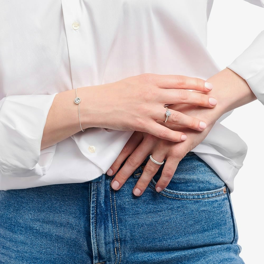 This 3. 5 mm wide ring, crafted from recycled silver, blends modern style with elegance and sophistication. Adorned with fine white zirconia pavé, it dazzles with its sparkle. Reflecting THOMAS SABO’s commitment to celebrating timeless beauty, this band ring is perfect for making it your favourite piece of jewellery and pairing it with other pieces to suit your style.