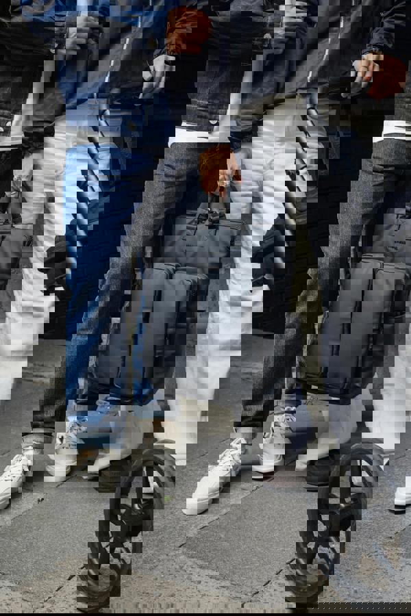 Meet Ozzy 2. 0, our utility tote/backpack - now updated with padded straps, and D-ring handle feature. Ozzy's hybrid design lets you wear this bag as a backpack, or hand-held tote, and can also be clipped to your buggy for hands-free strolling. Crafted from rubberised matte-black recycled polyester, set back to gun hardware, with 100% recycled lining + change mat. The design is characterised by two spacious pockets upfront (one being fully insulated, and the other featuring an internal mesh slip) providing you with plenty of storage space for parenting essentials. Its main compartment features a laptop sleeve and two elastic pockets for extra organisation. Showerproof, adaptable and full of features, Ozzy has you covered.
