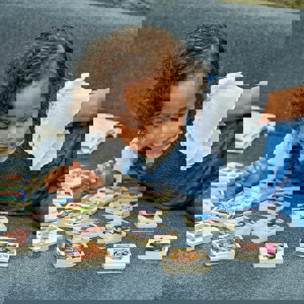 The smooth square wooden tiles are ideal for small hands, making them tactile and easy to grip, rotate and examine.