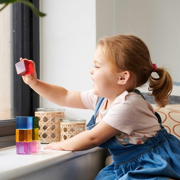 Holding two or more cubes together will create new colour combinations and hues; whilst using the cubes on a light panel or against a window to capture natural light will exaggerate and enhance the magic of colour mixing.