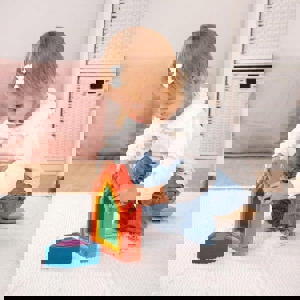 Our tickit® Rainbow Architect Houses are made from beautiful smooth solid beechwood with a natural woodgrain finish in the 7 different colours of the rainbow. The houses nest together as a set with the inner block being a solid 3D shape. This shape set will allow your child to unlock their creativity and innovation.