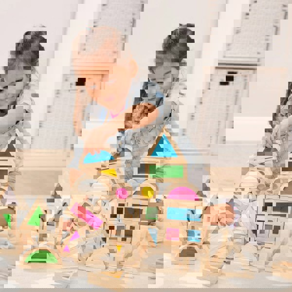 tickit® Rainbow Blocks & Mirror Blocks are different rubberwood shapes with colourful transparent acrylic and mirrored centres. The transparency of the acrylic allows light to pass through and create a visually stunning effect to captivate your child's imagination. Smooth and tactile, your child will love exploring their reflection, be captivated by the light reflection from the mirrored surface and enjoy simple block building.