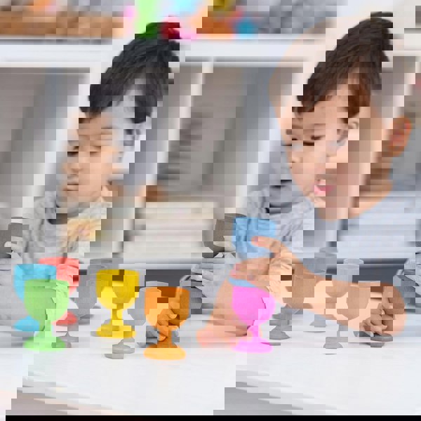 Set includes: 7 wooden egg cups in 7 different rainbow colours.