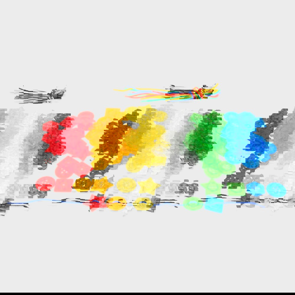 Set includes: 144 buttons in 6 colours (red, orange, yellow, green, blue, clear) and 4 shapes (star, circle, hexagon, square) with 12 coloured laces, all supplied in a convenient storage container.