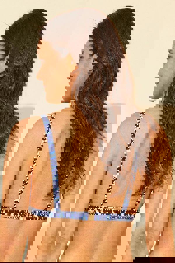 In a tie dye print, the Tie Dye Triangle Bikini Top is a women’s triangle bikini top with blanket stitch detailing. It fastens with a clip at the back and has lined cups with removable pads for adjustable shaping. Part of a coordinated range, it can be paired with other matching styles.