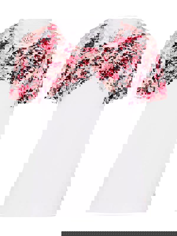 The shoulder cascading floral print of this top steals the show. Made in cotton/poly blend jersey, and is designed with an embellished pleated round neck, short sleeves, combining comfort and style. It's a must-have for your everyday wardrobe.