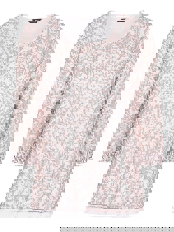 Easily elevate your top rotation with this new jersey lined mesh top . Made from a printed mesh fabric, it features a floral blurred print design, subtle sequins, and 3/4 length long sleeves. A top for all occasions you can feel confident in.