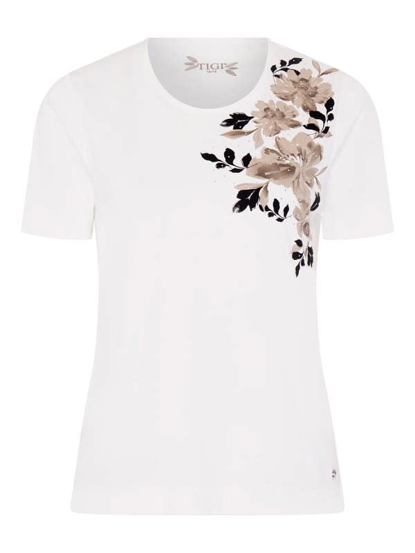 The Floral placement Top is the perfect addition to any woman’s wardrobe. The short sleeves and round neckline make it a versatile piece that can be worn for any occasion. The floral print and embellished details add a touch of femininity and style.
