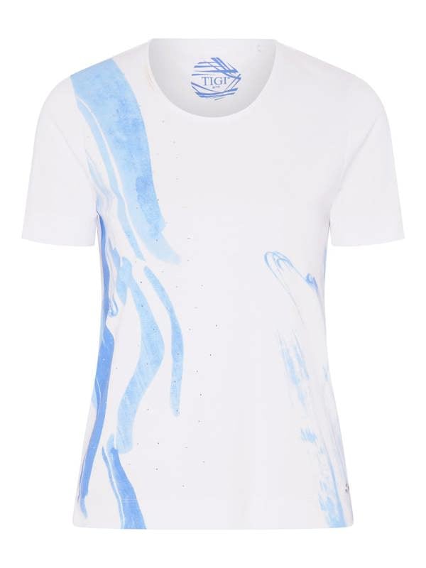 A summer essential, this poly-cotton jersey top makes an impact with its sweeping artistic splash wave print, highlighted with diamante nail-heads. Cut with a round neckline, and short sleeves for a relaxed look, making everyday dressing effortless.