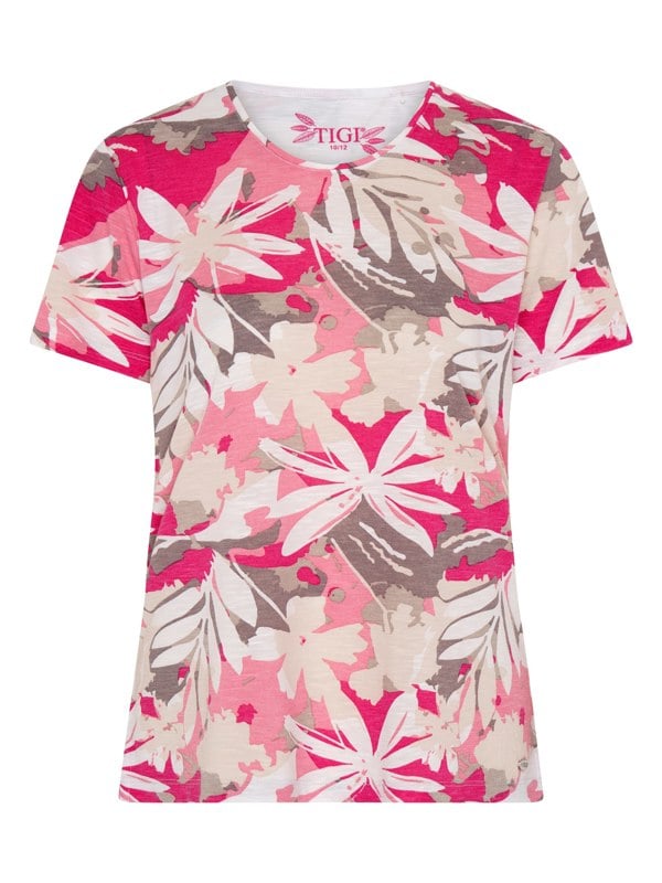 Bring a holiday feel to your summer wardrobe looks with this, artistically created tropical floral pattern top. It's designed in a regular fit with short sleeves and a round neckline. Wear with cropped bengalines for a perfect summer out-fit.