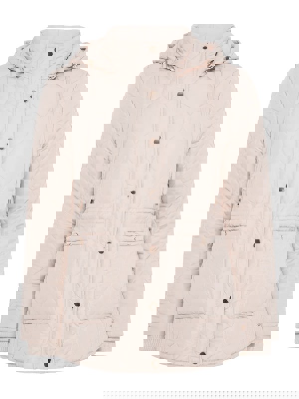 Stay warm in style with this padded coat featuring a subtle stitched pattern, front snap buttons, adjustable hood, and roomy pockets—perfect for cozy, casual layering on chilly days.