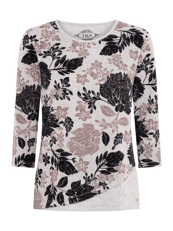 This curved hem top features a delicate floral print in soft taupe tones with a flattering scoop neck and 3/4 sleeves. The asymmetrical hem adds a stylish twist to this easy, everyday essential.