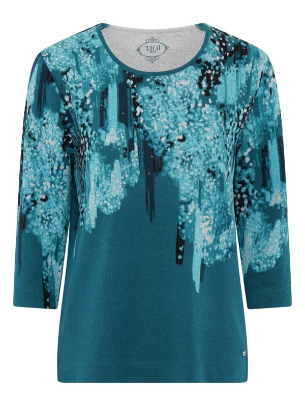 A new statement top for this season. Our top features an abstract placement design, with diamante highlights, a round neck line and 3/4 length sleeves. Simply style with jeans or trousers.