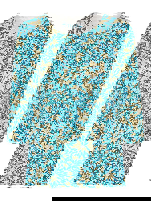 A beautiful top in a splash mosiac minimal design with subtle gathering under the rounded neckline. Added reasons we love this style is the wonderfully unique look, the soft stretch jersey finish, the drape, and flattering fit. A perfect go to style.