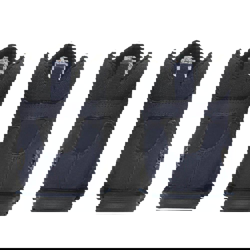 These Timberland Euro Rock boots are made with a nubuck leather upper in navy, cut to a mid-cut profile with contrast detailing and logo branding. A lace-up fastening runs through five eyelets, finished with a round toe and reinforced toe construction.