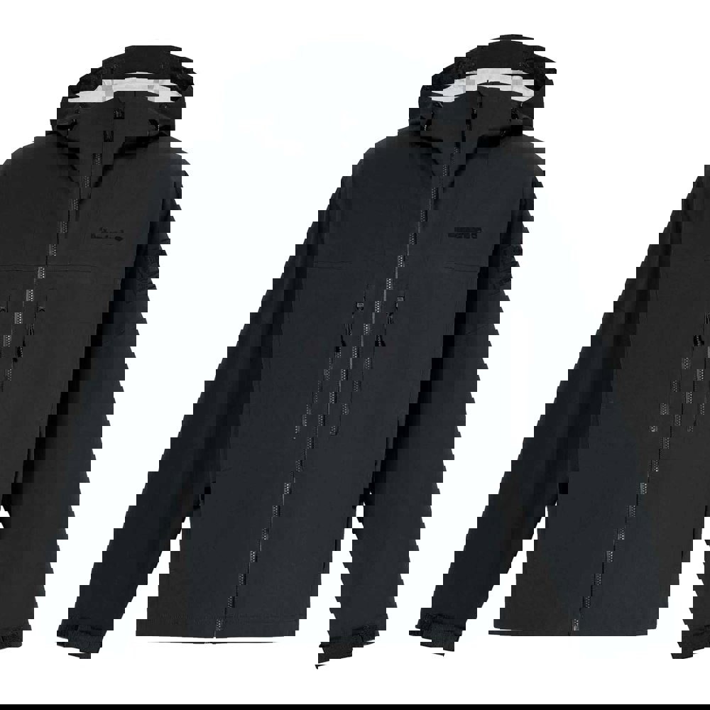Sealed seams and a full-length waterproof zip help maintain coverage, while underarm zips add ventilation when needed. The hood adjusts via a cord lock, and the hem draws in with an adjustable drawstring. For storage, it includes two side pockets and two chest pockets, with a mix of open and zip closures. Cuffs are elasticated and adjustable with touch fastening tabs.