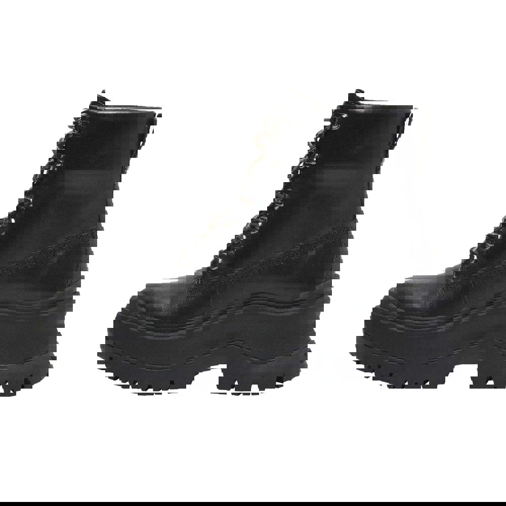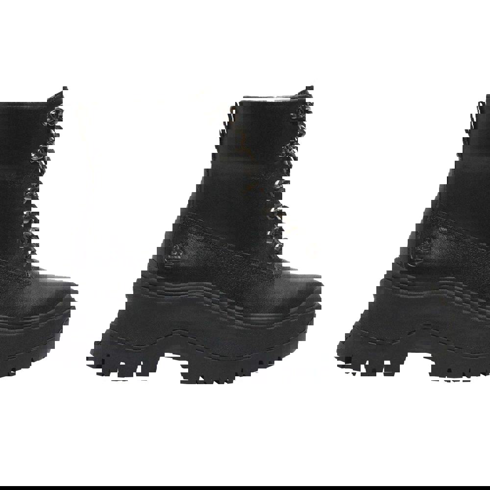 These Timberland Roxie Lane mid boots are made with a full grain leather upper in black, finished with a lace-up fastening through four eyelets. A pull tab supports easy on and off, while the mid cut profile and round toe shape keep the look clean and practical for everyday wear.