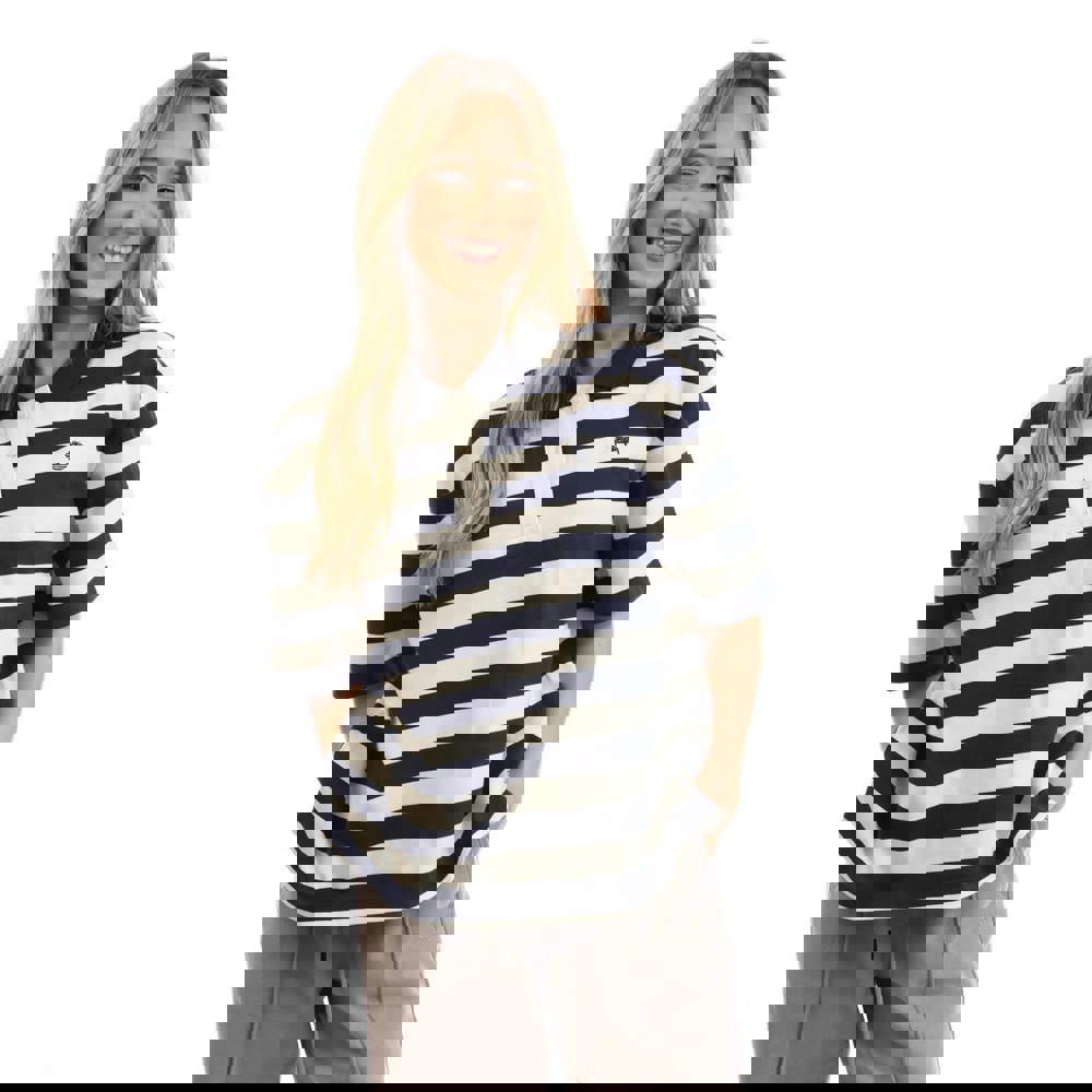 This short-sleeved polo shirt from Timberland comes in blue with a striped design and an embroidered logo. It has a relaxed fit and a classic polo neckline with ribbed detailing and a printed finish. The front is finished with a three-button placket, combining a button fastening with a pull-over style.