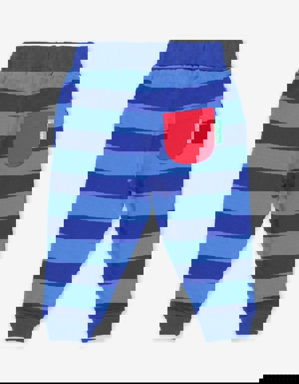 Little ones will be ready for anything in these super comfy contrasting stripy blue organic kids joggers. The soft organic cotton with comfy waistband and stretchy cuffs will keep little legs cosy and warm too. Mix and match with our organic applique or colourful basic T-shirts! Love these joggers? Check out our full collection of organic childrenswear joggers in bright and bold colours online at Toby Tiger.
