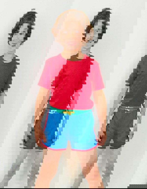 We love the retro vibes of these bright and bold blue organic summer shorts. Made from super soft 100%-certified organic cotton, the contrasting pink trim and green waistband styles them off nicely. Add one of our organic summer T-shirts to keep your cool this summer. Love these retro shorts? Check out our full collection of organic children's shorts in bright and bold colours online at Toby Tiger.