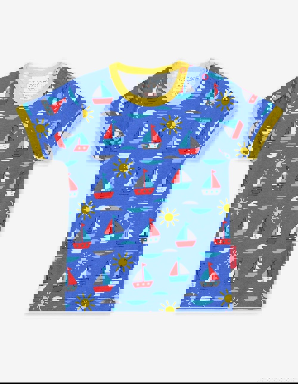 Ahoy there! Let's take to the high seas in this nautical summer organic cotton T-shirt. While colourful dinghies bob about on the deep blue sea, the sunshine-yellow trim finishes off this organic cotton T-shirt in style and will keep your little one cool and comfy all summer long. Love our bobbing boats? Check out our full nautical collection of organic childrenswear online at Toby Tiger.