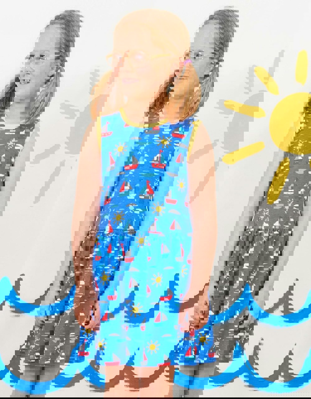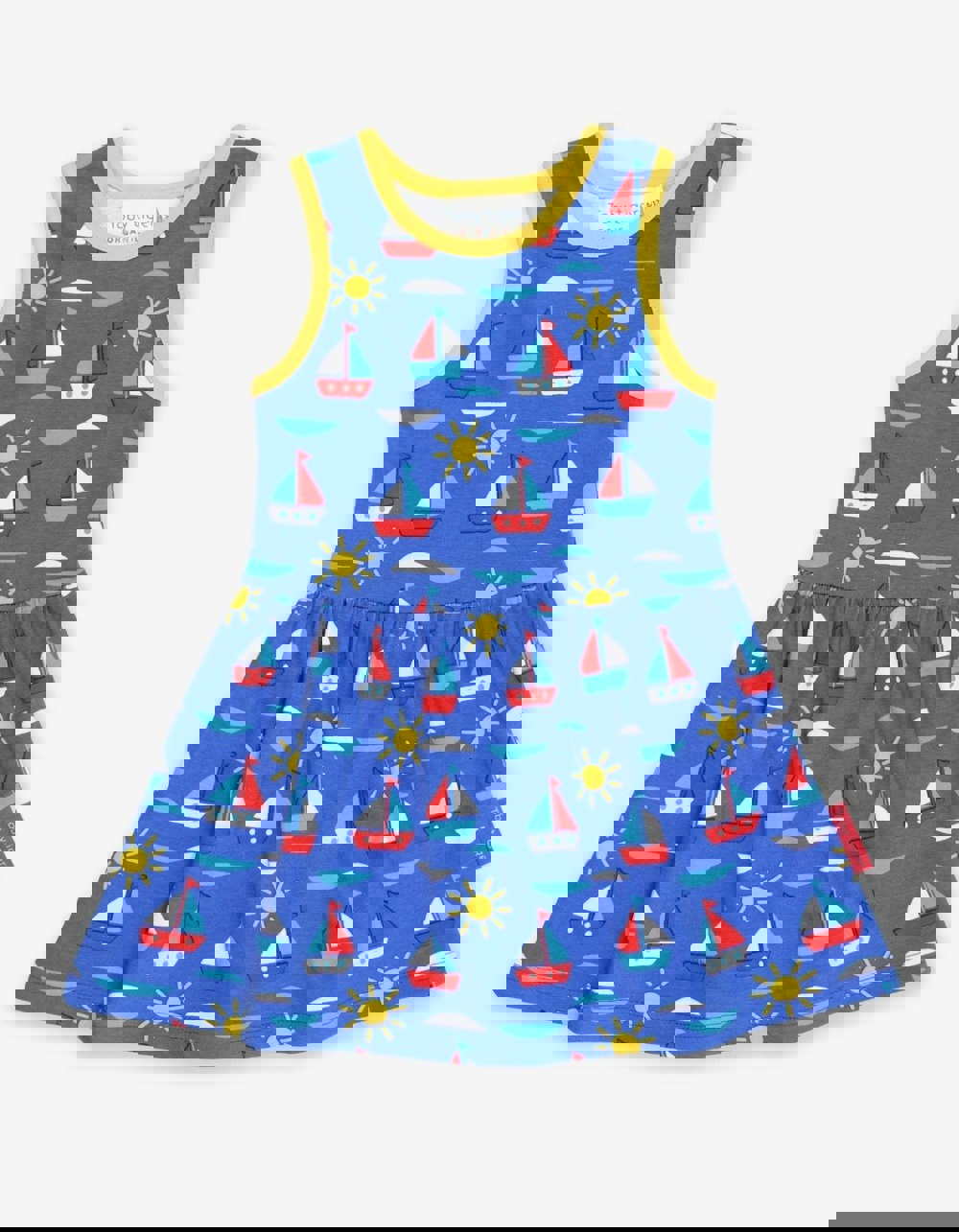 Get ready to set sail! Little ones will love to spin and whirl as colourful dinghies bob about on this soft organic cotton summer dress. Made from our super soft 100% GOTS-certified organic cotton with a full skirt and stylish sunshine-yellow trim, your little one will not only look the part, but keep their cool on a warm, sunny day. Love our bobbing boats? Check out our full nautical collection of organic childrenswear online at Toby Tiger.
