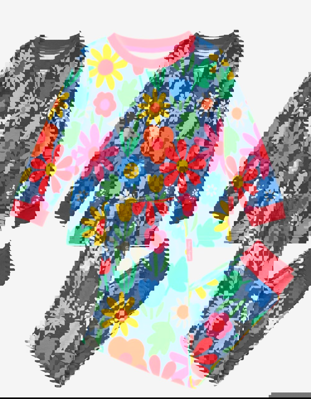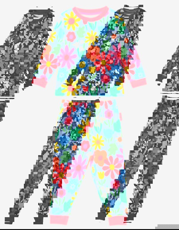 Get your little one ready for a restful night with these cosy pyjamas! Crafted from organic cotton and finished with a gentle waistband, these PJs are decorated with a bold floral print featuring vivid blooms of snowdrops, daisies, and tulips against a dark blue backdrop. Keep your child comfy and content all night long! The perfect nightwear for story time, outdoor adventures, and everything in between! They'll enjoy sweet dreams of nature and a soft fit that lasts. So you can rest easy knowing they're wrapped in comfort and snuggled up in style. For more floral delights, check out the full Toby Tiger Bold Floral collection online.