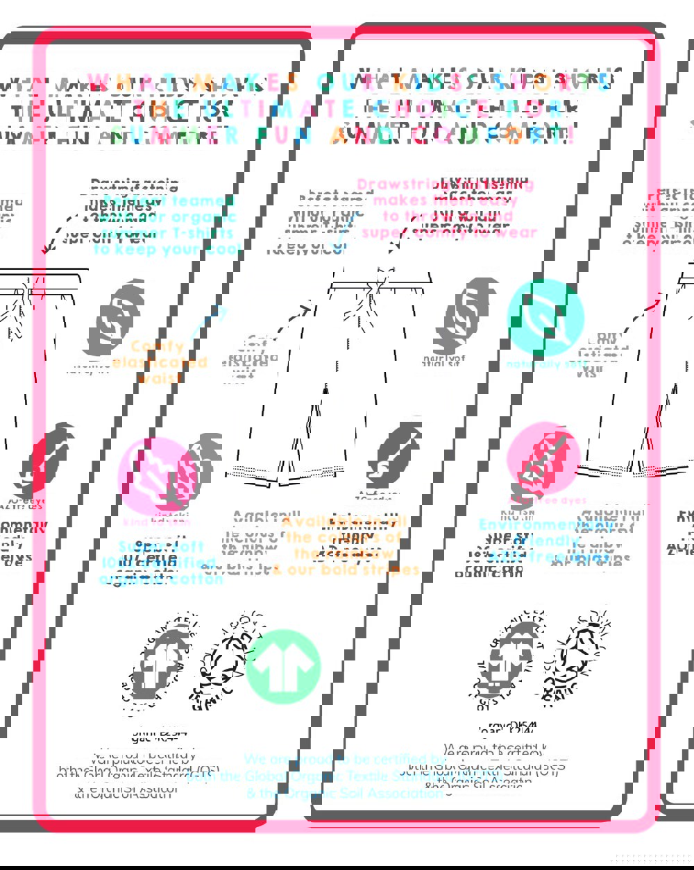 We love stripes! These Breton shorts are made from 100% certified organic cotton, they're soft, cool and perfect for all sorts of summer goings-on. A no-fuss drawstring fastening makes them easy to throw on and super comfy to wear. This looks great with lots of our colourful t-shirts.