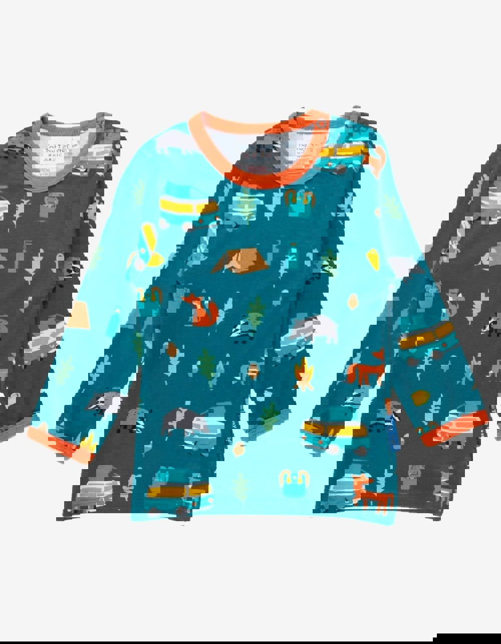 Embrace the staycation with our autumnal campervan organic long-sleeved kids T-shirt. Featuring all the campsite essentials alongside a few friendly curious little faces, soft organic cotton keeps little ones warm and cosy, while neck poppers on smaller sizes make changing time a breeze. Check out our full Camping collection, perfect for little adventurers.