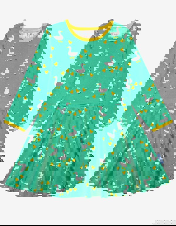 Combine downright cute and super-duper cool with our duck and chick print kids organic skater dress. This vibrant green organic cotton with a pop of yellow features long sleeves and full skirt for a stylish look this season and beyond. Kit out your little chicks with more of our duck collection, including T-shirts, yoga pants and appliques.
