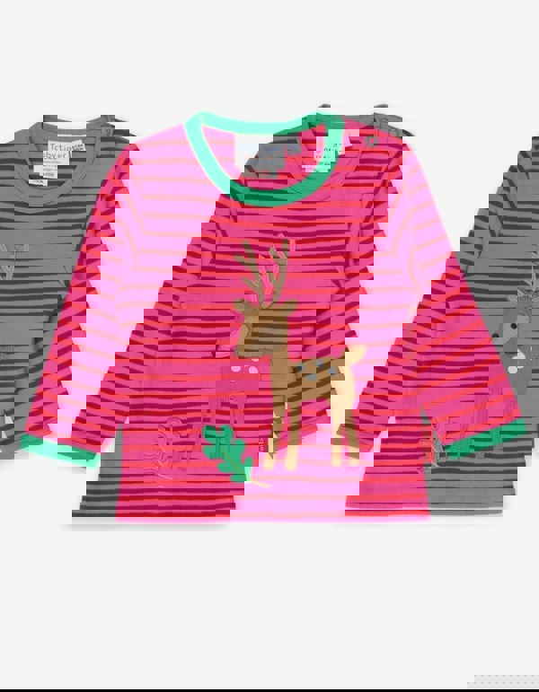 Hello, deer! Our soft applique pal is foraging for a tasty treat on this super soft organic T-shirt. With contrasting pink and red stripes and a stylish green trim, we're also treating you, to handy neck poppers on our smaller sizes for easy changing. This adorable T-shirt is perfect for any little one with a touch of whimsy. The applique pal is sure to make a statement with its contrasting stripes and green trim. And don't worry, we've got your back with handy neck poppers for easy changing. Love this look? Enter our Forest Adventure organic childrenswear collection online at Toby Tiger.