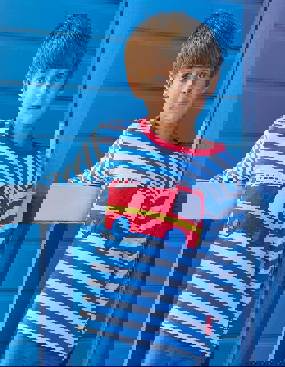 This fire truck shirt features one of our lovely soft applique designs on a blue and white striped t-shirt with red trims. Even better - sizes 6-12 months and 1-2 years come with extra poppers at the neckline to make changing easier!