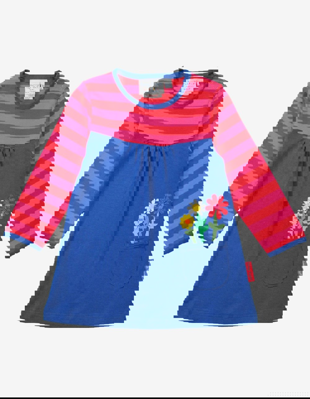 Beat the chill in style! Our fun and festive dark blue kids' dress comes with a bright pink contrast striped yoke and sleeves, and a stunningly colourful floral daisy applique stitched design in the pocket. Complete the look with our bright and colourful organic leggings - a perfect accompaniment for colder days! Add a pop of sunny style to any outfit, no matter the season! Our Organic Floral Applique Long-Sleeved Dress makes for a cheerful, ready-to-go look that's sure to brighten up even the gloomiest of days. Check out the full Toby Tiger Bold Floral collection online now.