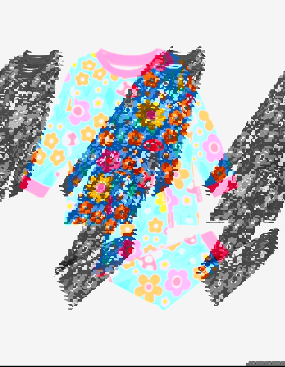 Made from super soft organic cotton, with a comfy waistband and cosy cuffs, your little dreamers will be in a land of make-believe in no time wearing these flowery kids pyjamas. Explore our full Rainbow Dinosaur collection of organic kids' clothes here at Toby Tiger.