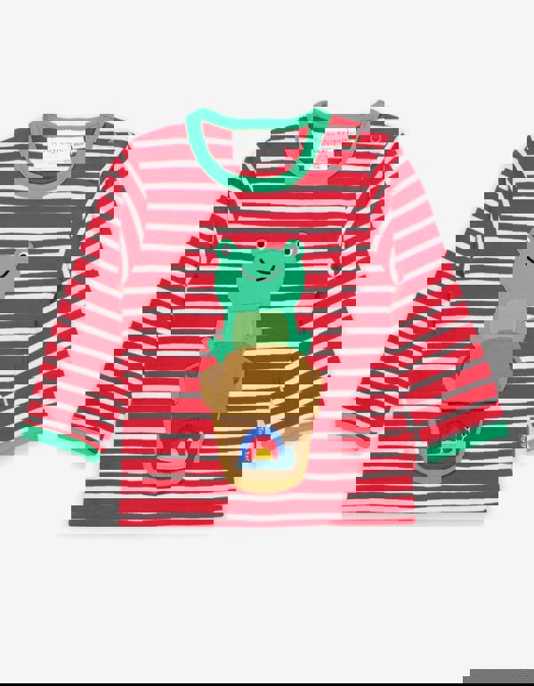 Perched upon the flower pot, our frog applique is ready to leap into spring – and so kids will be with this stripy organic cotton long-sleeved T-shirt. The stylish red and white stripes are finished with a bright green springtime trim. And, smaller sizes come with neck poppers for taking on and off with ease! Fan of the frog? Check out our frog-themed organic kids clothing online.