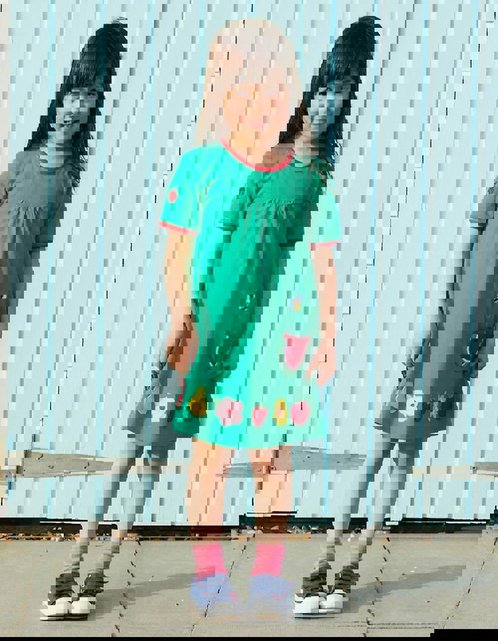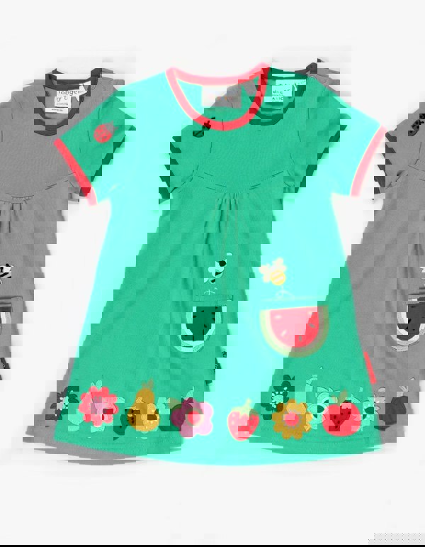 Blooming fruit and perfectly ripe appliques add extra springtime vibes to this organic cotton short-sleeve dress. Vibrant grass-green with a stylish red trim, this 100% GOTS certified cotton dress keeps kids cool in the heat and looks fab with a pair of our organic leggings on cooler days. We have a whole crop of springtime organic clothing featuring our flowers and fruits - take a look online at Toby Tiger!