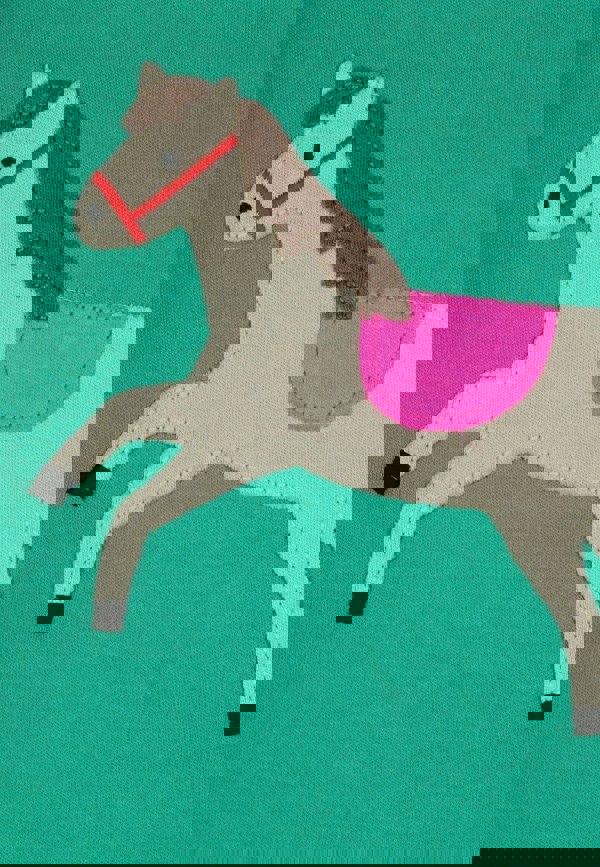 Saddle up for fun with our Organic Green Horse Applique Long-Sleeved T-Shirt! Crafted from soft, organic cotton, this vibrant green top features a spirited horse jumping applique on the front, while a No. 1 rosette graces the back for a winning touch.