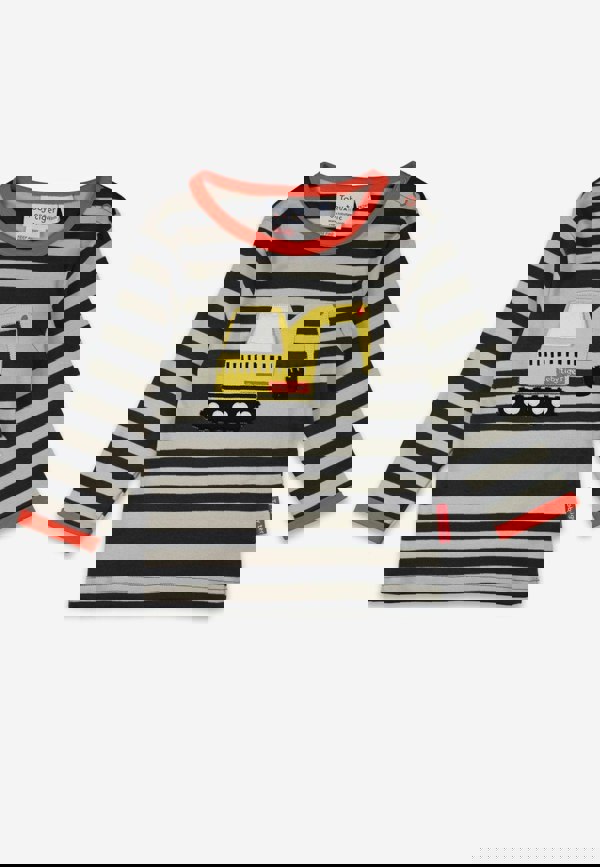 Get ready to dig in with our Organic Grey Digger Applique Long-Sleeved T-shirt! This dark and light striped tee is accented with a pop of bright orange trim. But the real fun is the interactive lift-the-flap detail that reveals the driver of the bright yellow digger. Perfect for little ones who love big machines!