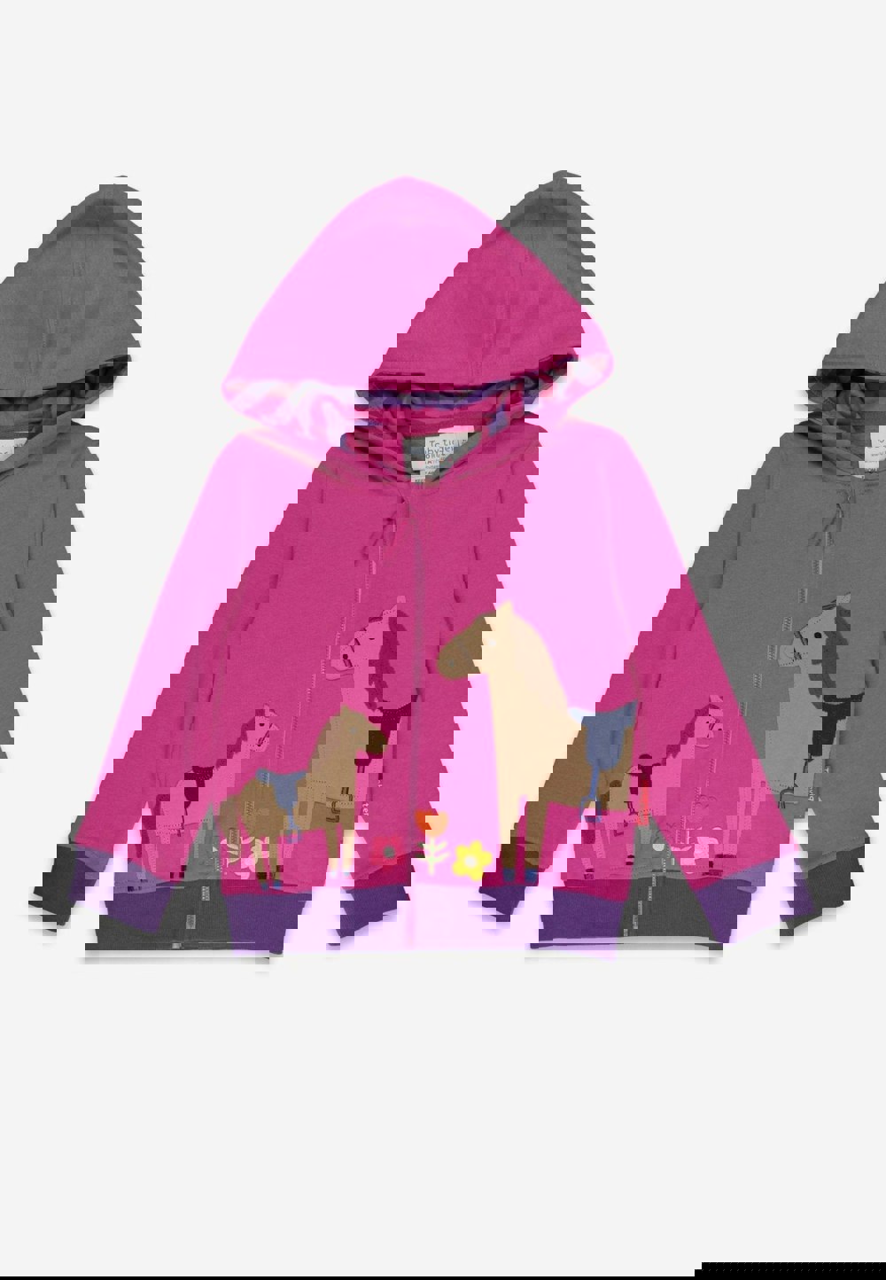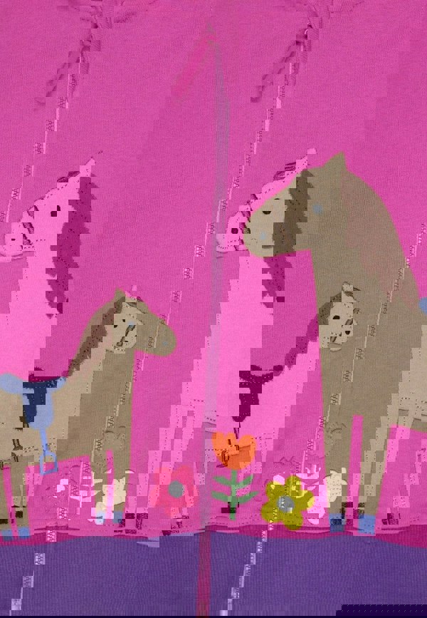 Ride in style with our Organic Hillside Pony Applique Hoodie! Made from 100% GOTS-certified organic cotton, this pink sweatshirt features whimsical applique horses and flowers, with soft purple cuffs and waist.