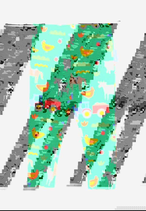 Get ready to roam the countryside in style with our Organic Hillside Print Leggings. These playful leggings feature an adorable farm print that includes tractors, cows, sheep, horses, chickens, apple trees, and more!