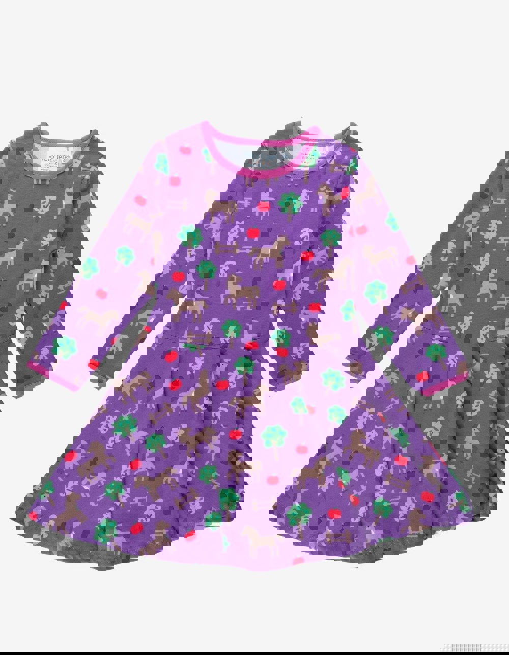 This scenic print in colourful pink and purple hues gives our kids organic skater dress some serious stand-out style. Made from 100% GOTS-certified organic cotton, the skirt is designed for twirling, showing off our horsey pals any time of year. During the colder months, layer with our organic leggings for extra warmth and cosiness. Love a bit of horseplay? Discover our eco-friendly Horse and Apple collection at Toby Tiger.