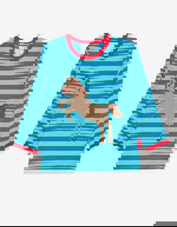 Our happy horse gallops and prances about on this light blue stripy t-shirt. Made from 100% certified organic cotton, the long sleeves make it ideal on a chillier day, while the pop of orange on the trim adds a splash of sunshine. Our smaller sizes come with poppers on the neck so changing will be a breeze. Try this top with our funky leggings or dungarees for a great outfit!