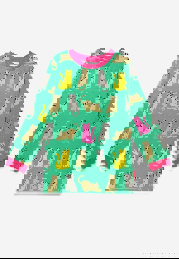 Introducing our playful Organic Kitten Print Pyjamas! Made with 100% GOTS-certified organic cotton, these PJs are not only super soft to the touch but also environmentally friendly with AZO-free dyes. The green base with grey, yellow, and pink kitten print and pink trim is a unique design from Toby Tiger. Your little ones will sleep comfortably and guilt-free, as these pyjamas are also machine washable at 30 degrees. Purrrfect for a good night's sleep!